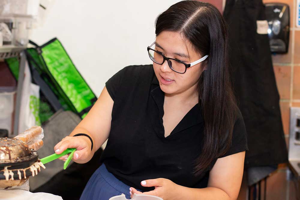 To date, Rebecca has spent 252 hours working in our commercial kitchen. Last festival season, she spent 92 hours chopping strawberries, mixing the batter, and preparing her ingredients in the kitchen. By renting space through Ventures, she was able to save between $874 – $3,404 on hourly rental fees in the summer of 2019. It is savings like that have made it possible for Rebecca to hire seven employees to operate her food cart. She is not alone; Ventures incubation programs have helped business owners employ between 85 and 122 people each year since 2017.
